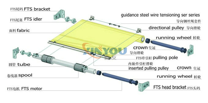 FTS天棚簾特別適用于普通電動卷簾無法安裝的彎曲、傾斜的場合,整個系統(tǒng)由驅動系統(tǒng)、面料和控制系統(tǒng)三部分組成,驅動系統(tǒng)采用2FTS專用管狀電機,分別安裝在兩條卷管中,面料一端固定在其中一條卷管上,固定面料另一端的鋼絲繩卷曲在另一條卷管的卷繩器上。這兩臺電機通過一個專用的控制器協(xié)調(diào)工作,其中一臺電機提供面料運行的動力,另一臺電機的剎車同時工作,提供一定的阻力拖住面料,避免面料下墜,天棚完全打開后,面料會卷在其中一條卷管上,運行中或停止時面料均有張力,可制作大面積的平面或弧形面的天棚簾系統(tǒng)。